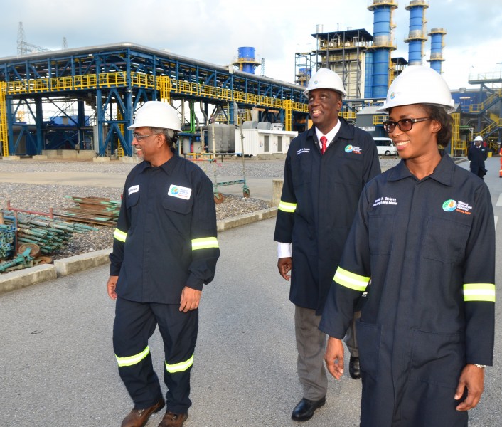 Energy Minister Nicole Olivierre, Public Utilities Minister Brigadier Ancil Antoine (centre) and Namdeo Boodram (left) CEO of TGU as they tour the TGU Power Plant on La Brea