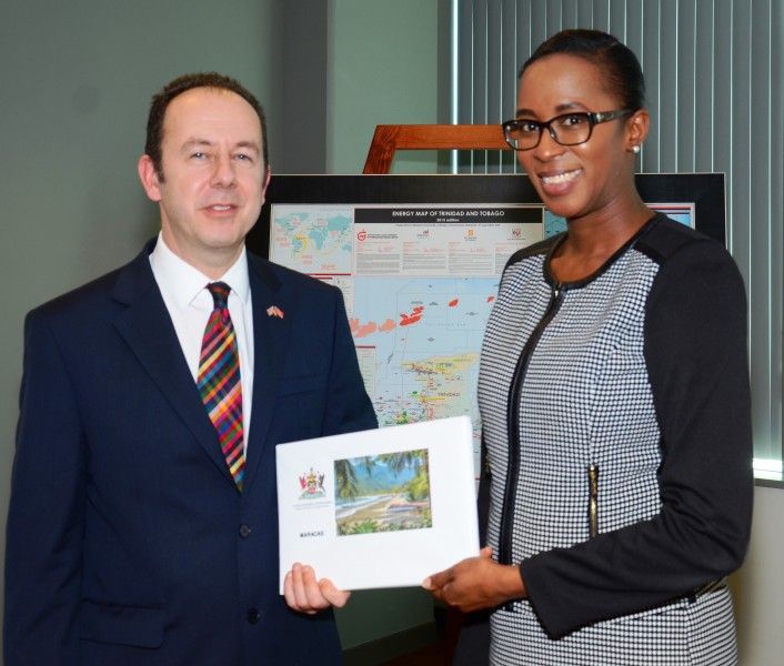 Energy Minister Nicole Olivierre presents a token to the British High Commissioner to the Republic of Trinidad and Tobago His Excellence Tim Stew MBE.