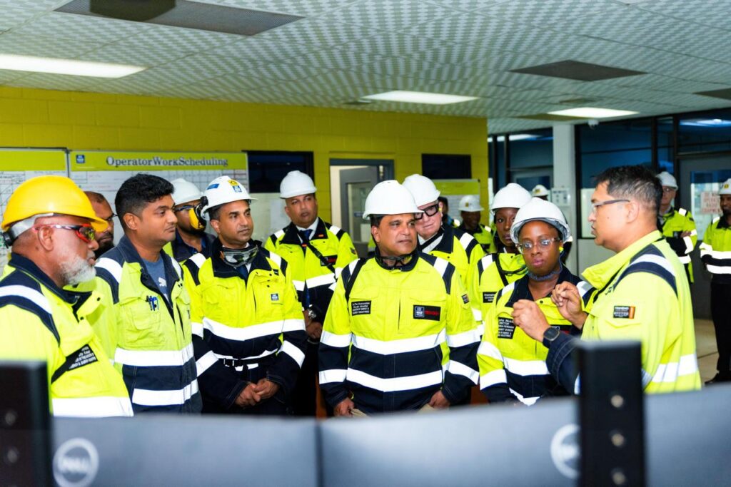 Dr the Honourable Roodal Moonilal Minister of Energy and Energy Industries, the Honourable Ernesto Kesar Minister in the Ministry of Energy and Energy Industries engage with Yara-TRINGEN employees.
